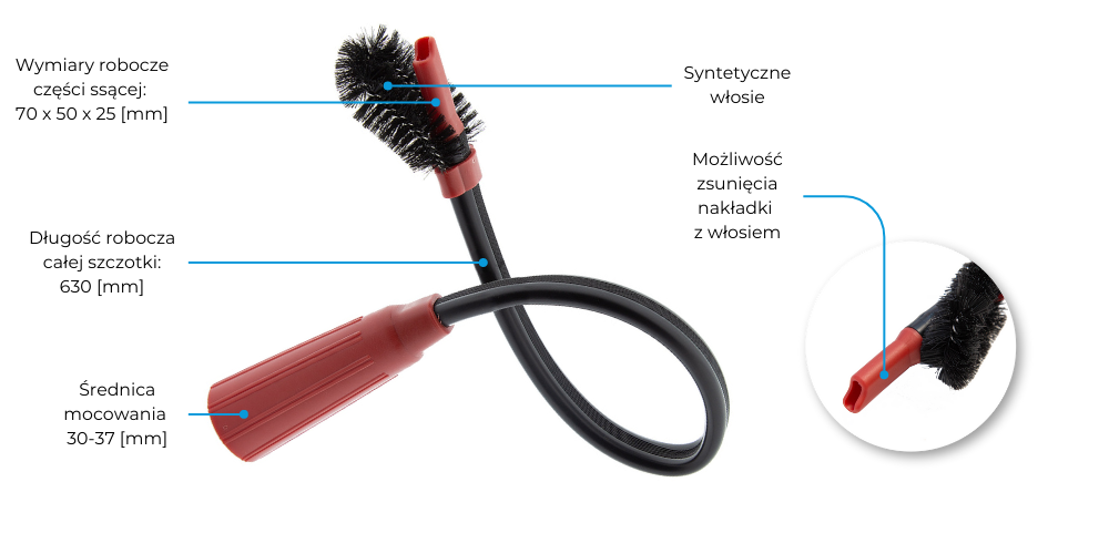 Ssawka została wykonana z wytrzymałego, giętkiego tworzywa, które nie odkształca się trwale – po wygięciu zawsze wraca do swojej formy. Stożkowy system montażu (30-37 mm) sprawia, że ssawka "klinuje" się stabilnie w rączce odkurzacza, zapewniając szczelność i maksymalną siłę ssania.